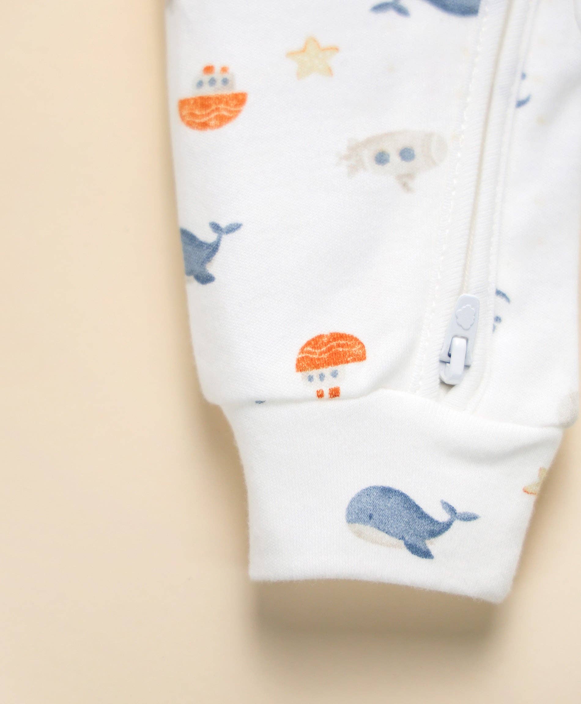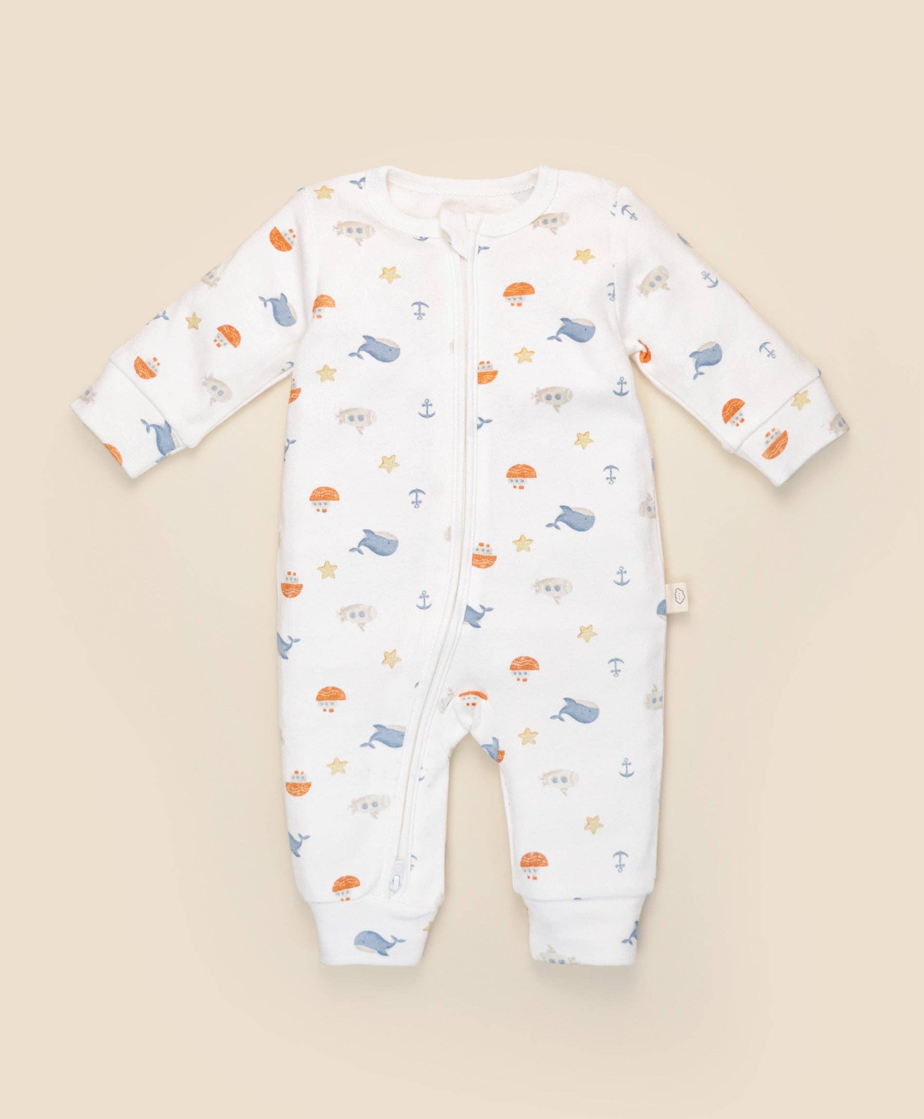 Features a two-way zip and a safety fold for quick and easy dressing. Soft and stretchy, our growsuits are an easy-care, fuss-free option that’s easy to wear thanks to their modern, fitted style. Babywear, blue, Boy, Girl, growsuit, sea world, Unisex